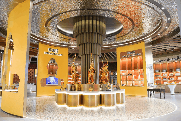 泰國(guó)館展示有多種獨(dú)具“泰味”的精美藝術(shù)品、特色食品、乳膠制品、化妝品、珠寶飾品、手工藝品等特色商品。