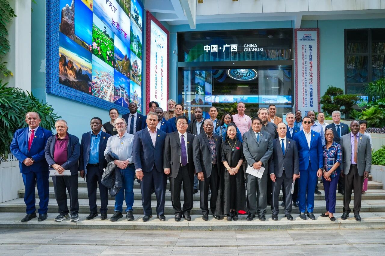 八桂大地,金風送爽,碩果飄香。 2025年10月28日,來自阿根廷、克羅地亞、喀麥隆、肯尼亞、約旦、哥倫比亞、韓國等國家的駐華大使及外交官齊聚廣西,開啟為期3天的實地考察之旅,探尋廣西的發(fā)展動能與合作空間。在廣西壯族自治區(qū)外事辦公室黨組成員、副主任宋海軍的陪同下,駐華使節(jié)代表團首站即走進中新南寧國際物流園(簡稱“中新物流園”)和中國—東盟特色商品匯聚中心(簡稱“匯聚中心”)。廣西新中產(chǎn)業(yè)投資有限公司、中國—東盟特色商品匯聚中心董事長趙海燕熱情接待駐華使節(jié)代表團。