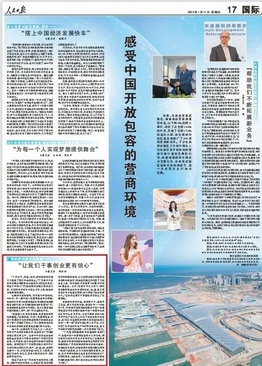 1月11日,《人民日報》第17版刊登《感受中國開放包容的營商環(huán)境》的報道。得益于中國(廣西)自由貿(mào)易試驗區(qū)的快速發(fā)展,外國投資者切身感受著開放包容的營商環(huán)境和蓬勃發(fā)展的機遇,加速在當(dāng)?shù)氐脑鲑Y進(jìn)資。其中采訪了廣西新中產(chǎn)業(yè)投資有限公司董事長趙海燕,相關(guān)報道摘錄如下:
